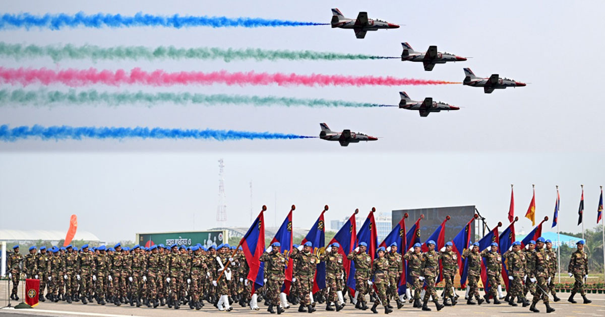 পাঁচটি এফ-সেভেন যুদ্ধবিমান বর্ণিল রং ছাড়তে ছাড়তে প্যারেড গ্রাউন্ড প্রদক্ষিণ করে। ‘লো লেভেল’ ফ্লাইং বিমান প্রদর্শনীর পর যোগ দেয় মিগ-২৯ যুদ্ধবিমান।